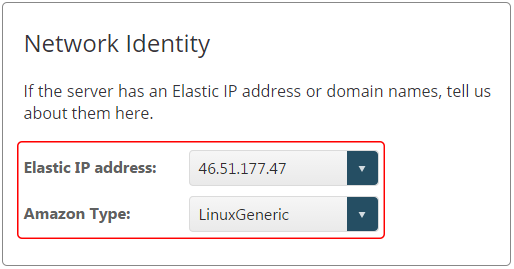for the server – this will take you to the Identity tab of the Edit Server screen. The Elastic IP address and Amazon Type settings are found in the Network Identity section.